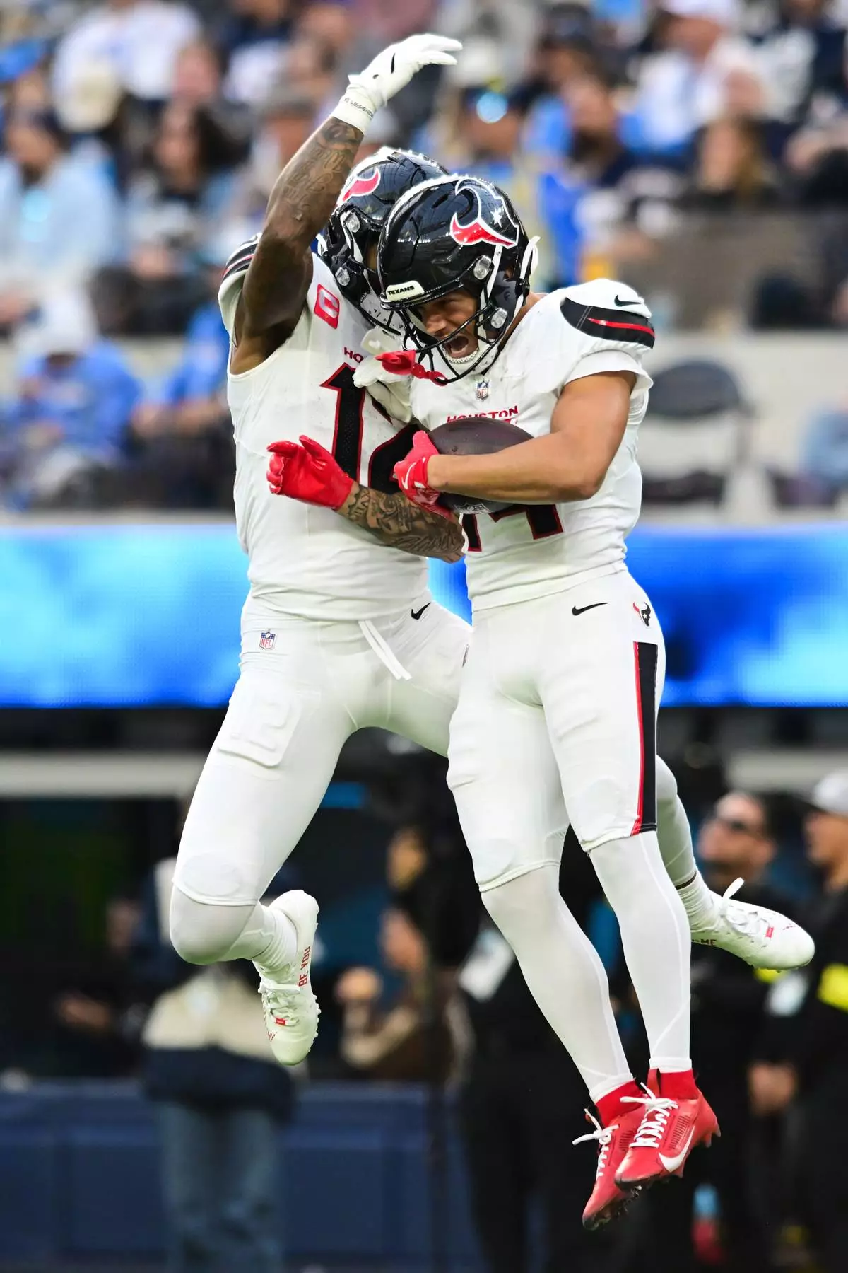 Houston Texans wide receiver Jaylin Noel, right, celebrates his touchdown with wide receiver Nico Collins during the first half of an NFL football game against the Los Angeles Chargers Saturday, Dec. 27, 2025, in Inglewood, Calif. (AP Photo/Wally Skalij)
