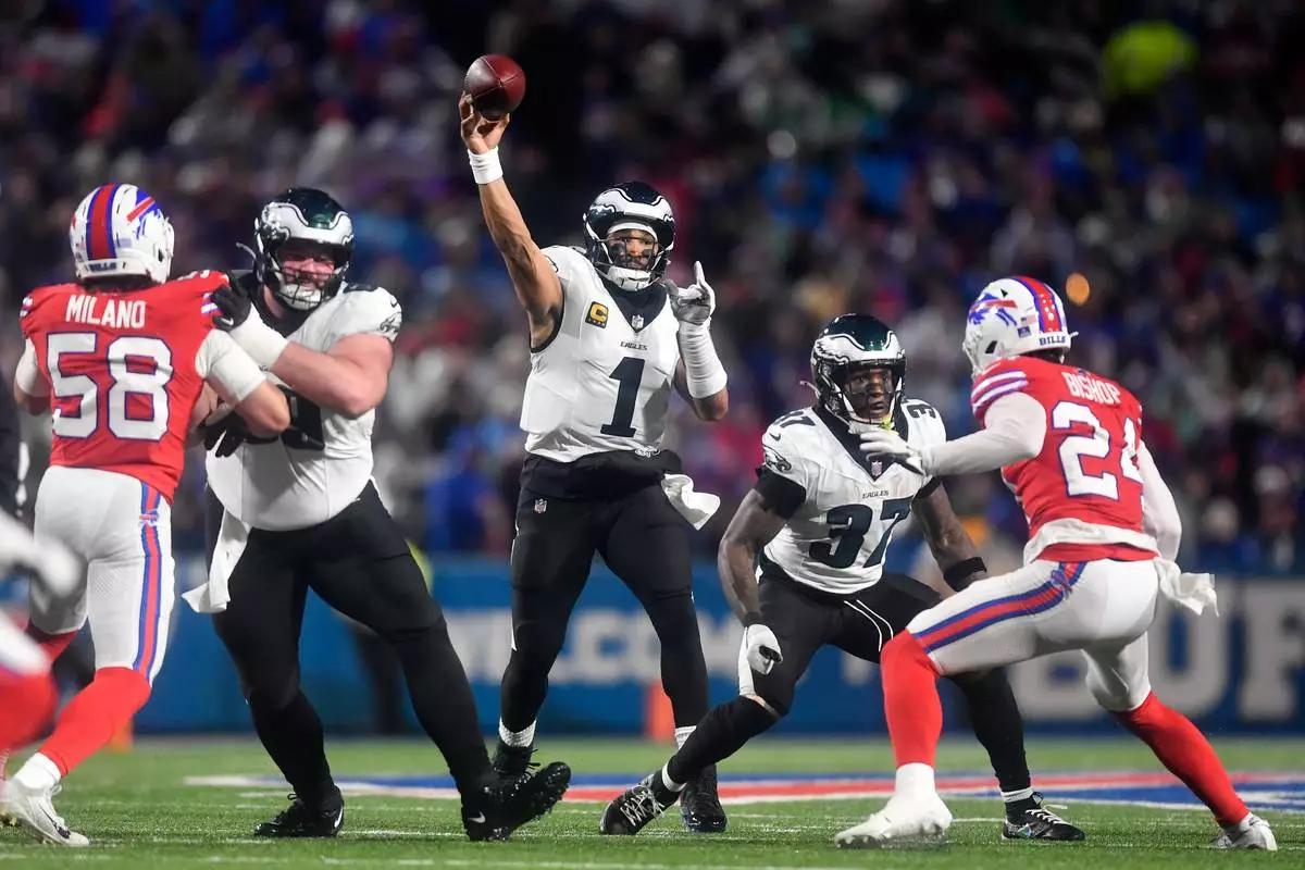 Philadelphia Eagles' Jalen Hurts passes during the first half of an NFL football game against the Buffalo Bills, Sunday, Dec. 28, 2025, in Buffalo, N.Y. (AP Photo/Adrian Kraus)