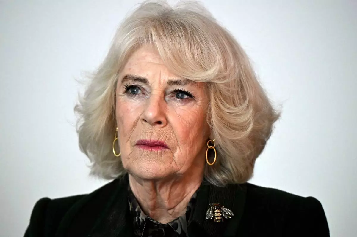 FILE - Britain's Queen Camilla looks on during a visit to open a new purpose-built Sexual Assault Referral Centre (SARC) in Exeter, England, Thursday Feb. 6, 2025 during the national Sexual Abuse and Sexual Violence Awareness Week 2025. (Justin Tallis/Pool Photo via AP, File)