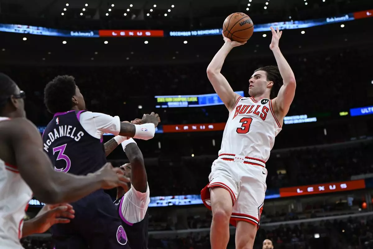 Chicago Bulls' Josh Giddey (3) goes up to shoot against Minnesota Timberwolves' Jaden McDaniels (3) during the first half of an NBA basketball game Monday, Dec. 29, 2025, in Chicago. (AP Photo/Paul Beaty)