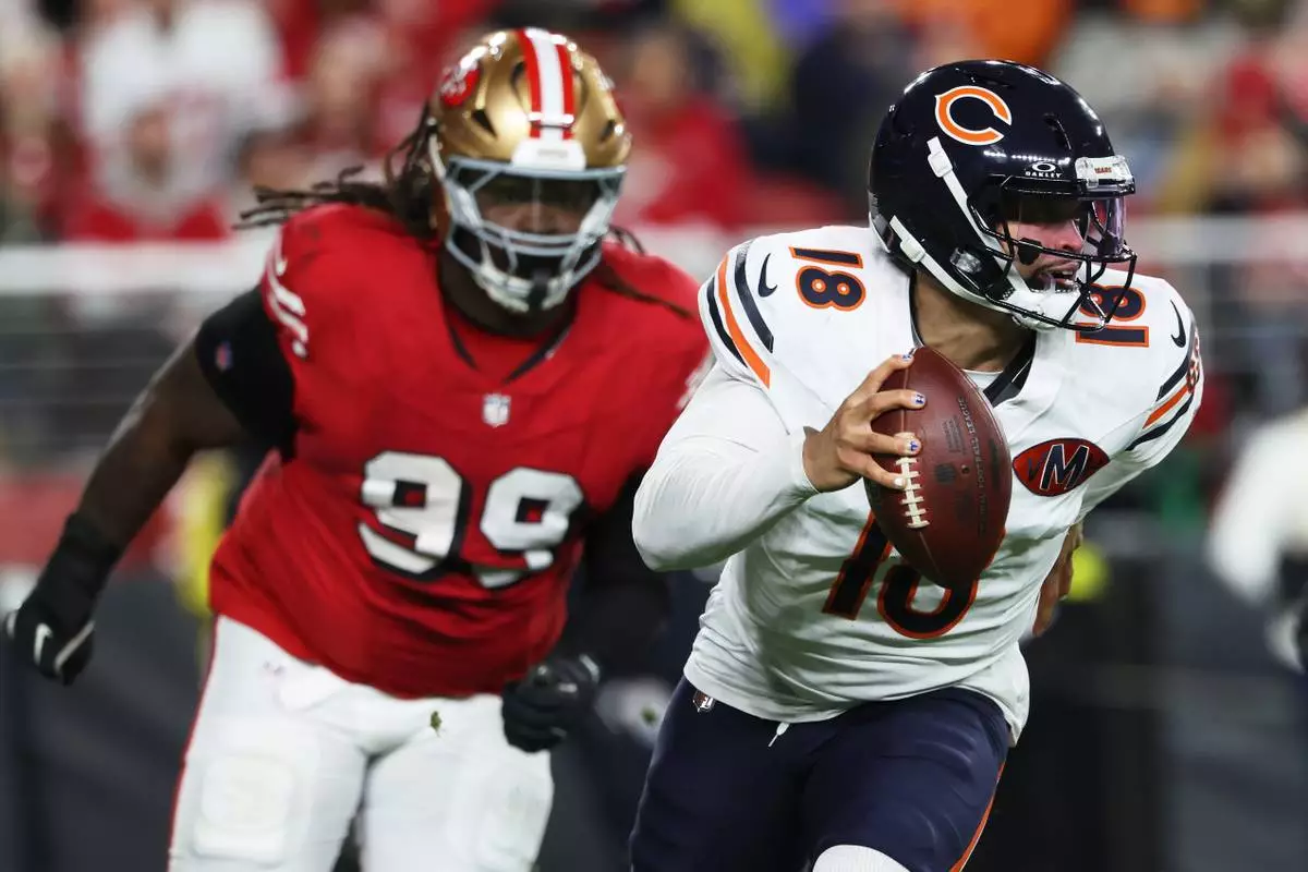 Chicago Bears quarterback Caleb Williams (18) scrambles away from San Francisco 49ers defensive tackle CJ West (99) during the first half of an NFL football game in Santa Clara, Calif., Sunday, Dec. 28, 2025. (AP Photo/Jed Jacobsohn)