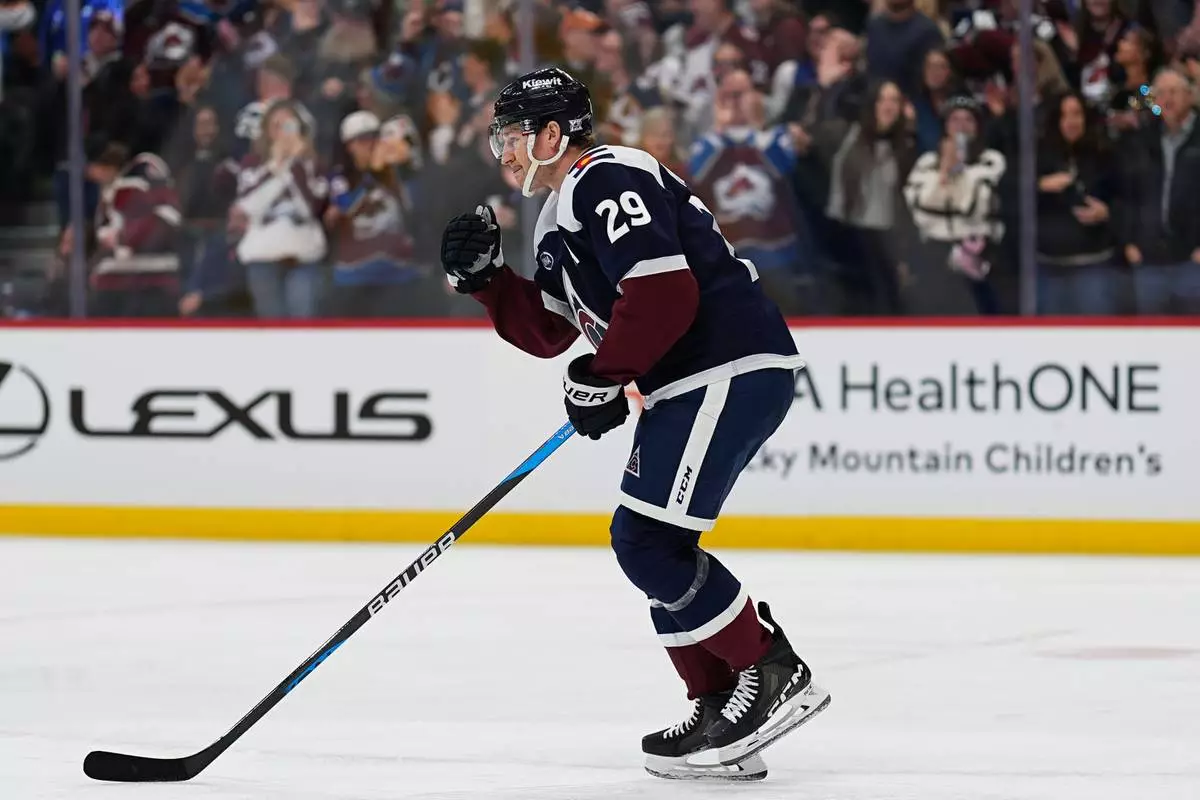 Colorado Avalanche center Nathan MacKinnon celebrates as he skates back to the team box after scoring a goal against the St. Louis Blues in the first period of an NHL hockey game Wednesday, Dec. 31, 2025, in Denver. (AP Photo/David Zalubowski)