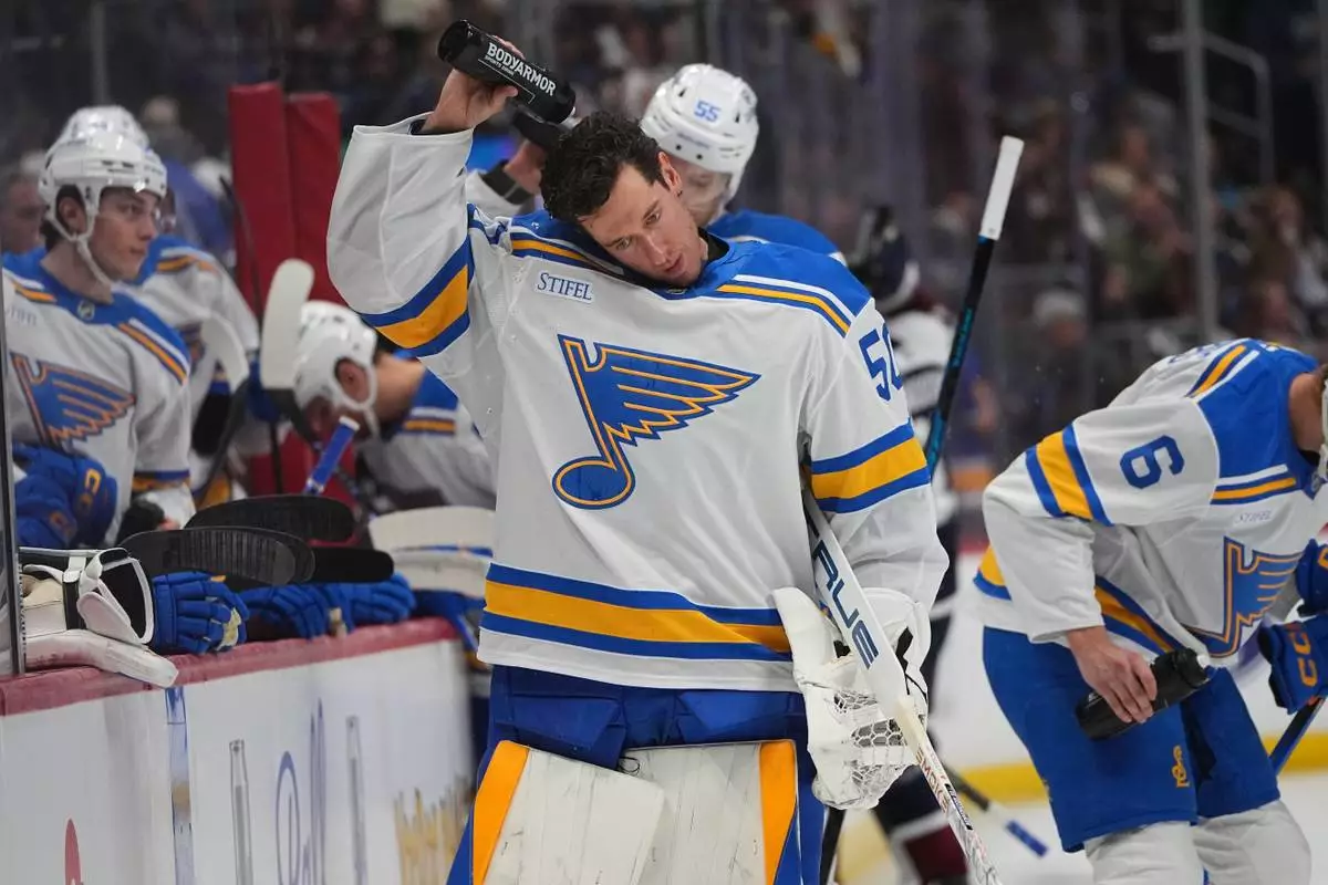 St. Louis Blues goaltender Jordan Binnington cools down during a time out in the first period of an NHL hockey game against the Colorado Avalanche, Wednesday, Dec. 31, 2025, in Denver. (AP Photo/David Zalubowski)