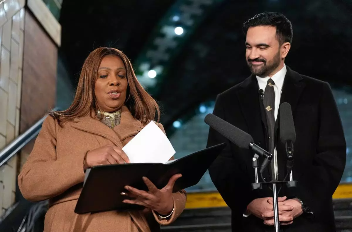 New York Attorney General Letitia James, left, prepare to administer the oath of office to mayor-elect Zohran Mamdani, Thursday, Jan. 1, 2026, in New York. (AP Photo/Yuki Iwamura)