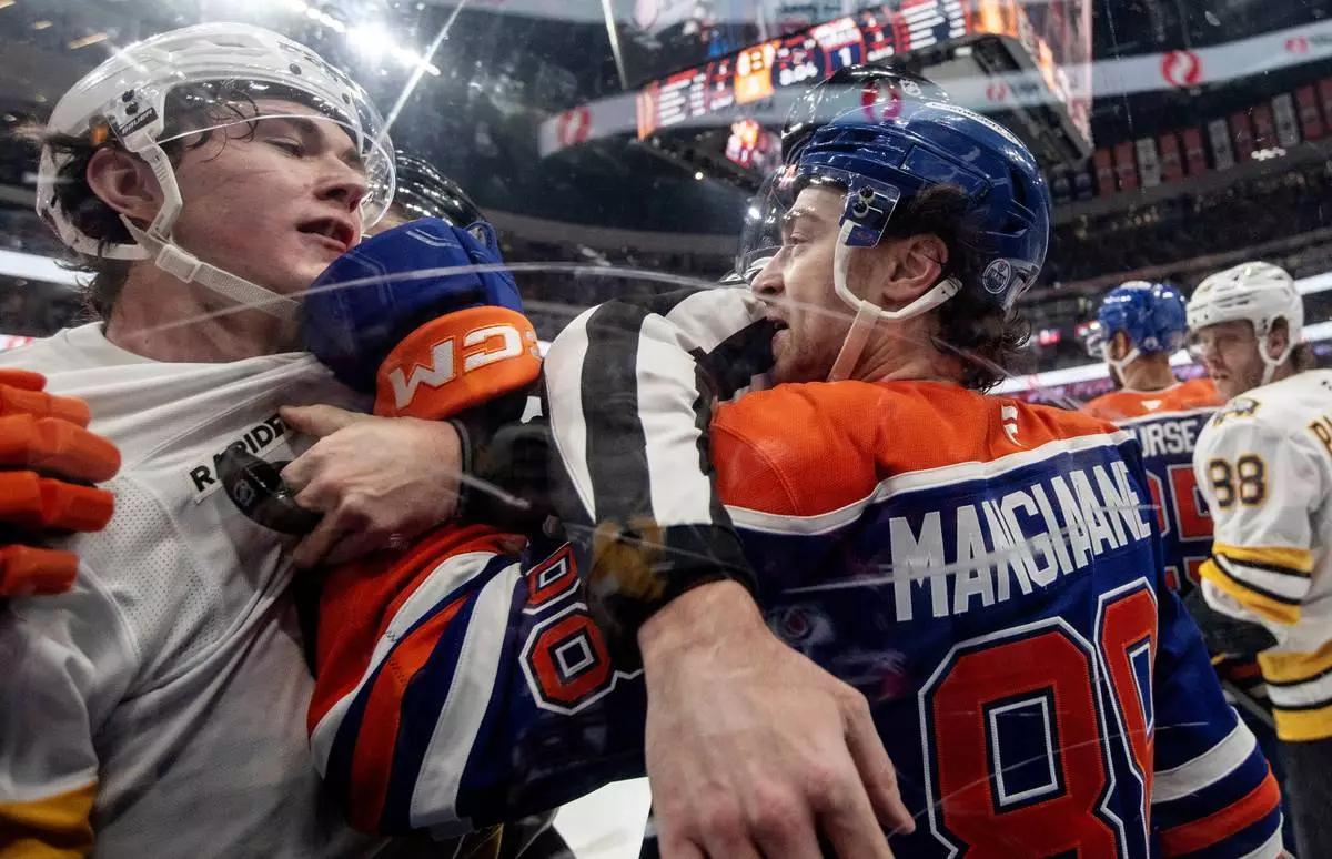 Boston Bruins' Fraser Minten (93) and Edmonton Oilers' Andrew Mangiapane (88) rough it up during the second period of an NHL hockey game, in Edmonton, Alberta, Wednesday, Dec. 31, 2025. (Jason Franson/The Canadian Press via AP)