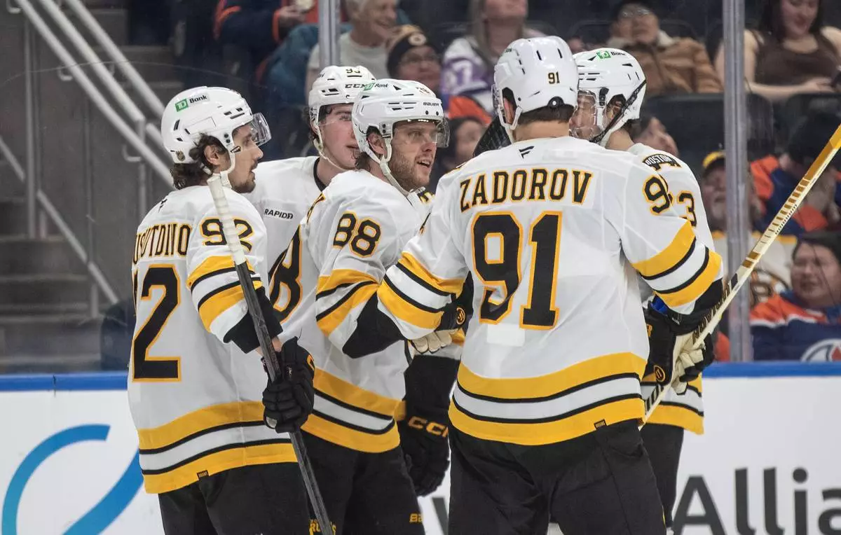 Boston Bruins David Pastrnak (88) celebrates a goal with teammates against the Edmonton Oilers during the third period of an NHL hockey game, in Edmonton, Alberta, Wednesday, Dec. 31, 2025. (Jason Franson/The Canadian Press via AP)