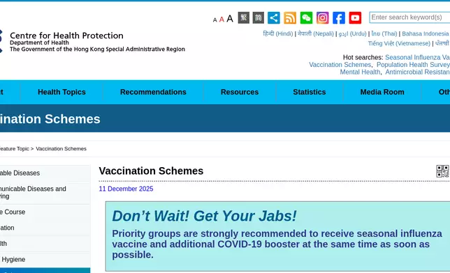 In addition, many respiratory pathogens, including influenza and SARS-CoV-2, may have increasing activity and community transmission during winter. Seasonal influenza vaccination is recommended for all persons aged 6 months or above, except those with known contraindications. Persons at higher risk of getting influenza and its complications, including the elderly and children, should receive seasonal influenza vaccinations early. Please see details of the vaccination schemes on theCHP'swebsite.