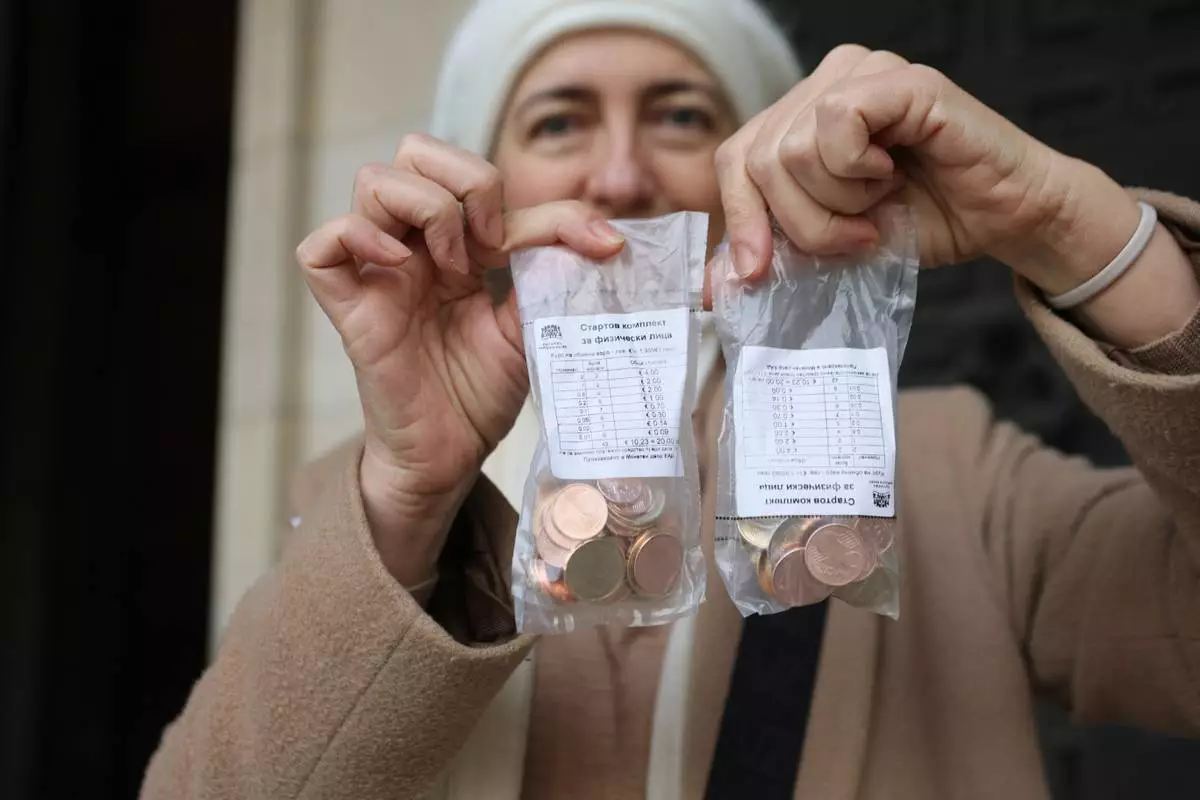 A woman poses as she holds new euro coins with Bulgarian symbols in Sofia in front of Bulgarian National Bank, Saturday Dec. 27, 2025. (AP Photo/Valentina Petrova)
