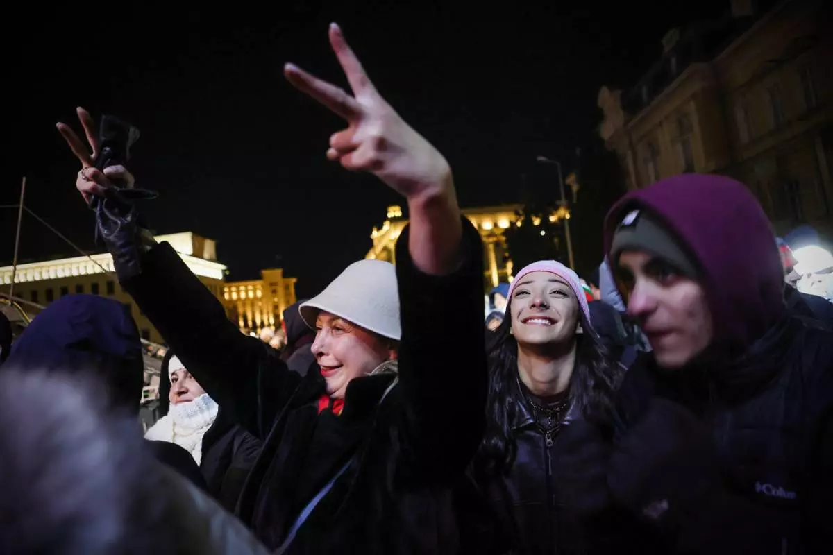 Bulgarians sing and shout as they celebrate the New Year and Bulgaria's adoption of the euro in front of the Bulgarian National Bank in Sofia, Bulgaria, Wednesday, Dec. 31, 2025. (AP Photo/Valentina Petrova)