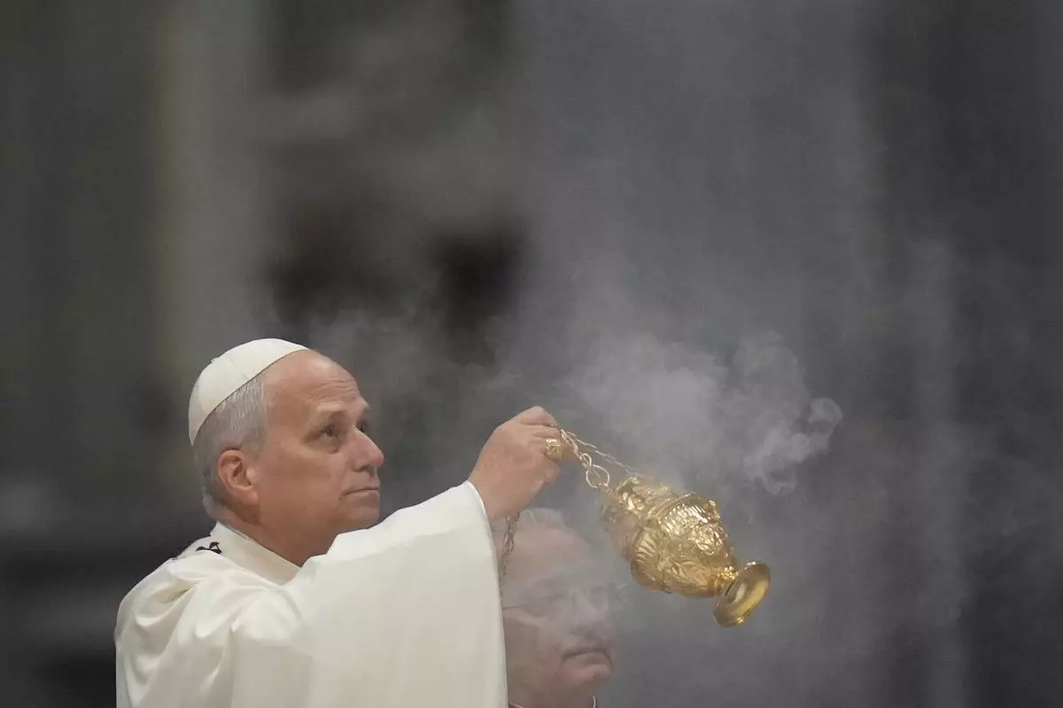 Pope Leo XIV celebrates Mass on New Year's Day, in St. Peter's Basilica at the Vatican, Thursday, Jan. 1, 2026. (AP Photo/Alessandra Tarantino)
