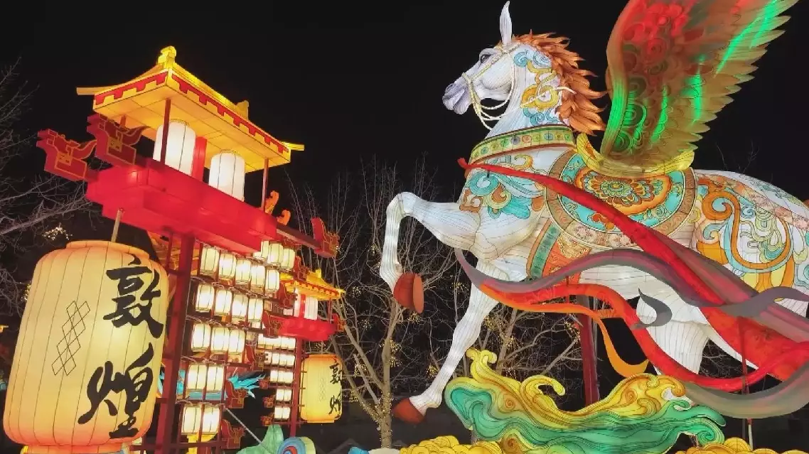 In Dunhuang City of neighboring Gansu Province, over 1,200 distinctive lanterns lit up the night, including 20 main lanterns that incorporate elements from famous Dunhuang murals, such as flying apsaras, nine-colored deers, and winged horses. and the 12 Chinese zodiac animals. The dazzling display of horse-themed lanterns for the coming Chinese lunar Year of the Horses became a popular spot for shutterbugs.