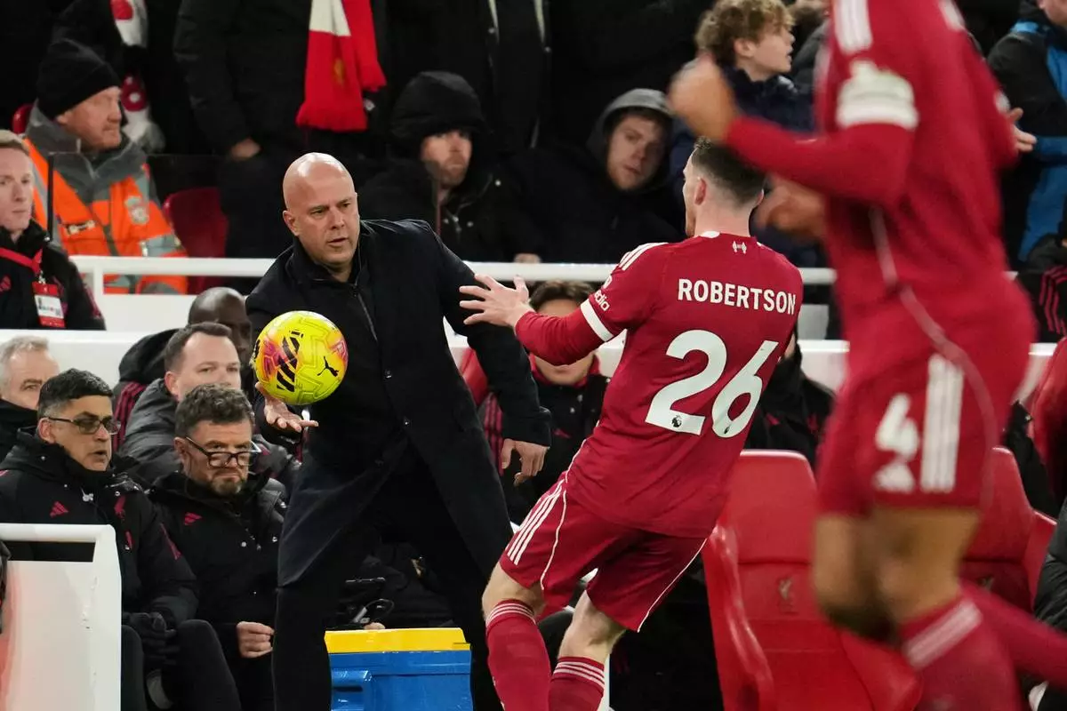 Liverpool's manager Arne Slot, left, passes the ball to Liverpool's Andrew Robertson during the English Premier League soccer match between Liverpool and Leeds United in Liverpool, England, Thursday, Jan. 1, 2026. (AP Photo/Jon Super)