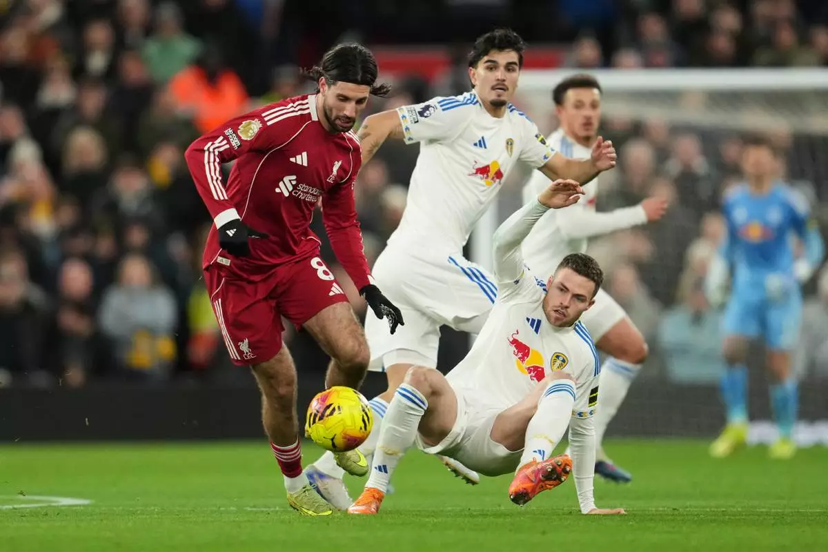 Liverpool's Dominik Szoboszlai, left, and Leeds' Gabriel Gudmundsson challenge for the ball during the English Premier League soccer match between Liverpool and Leeds United in Liverpool, England, Thursday, Jan. 1, 2026. (AP Photo/Jon Super)