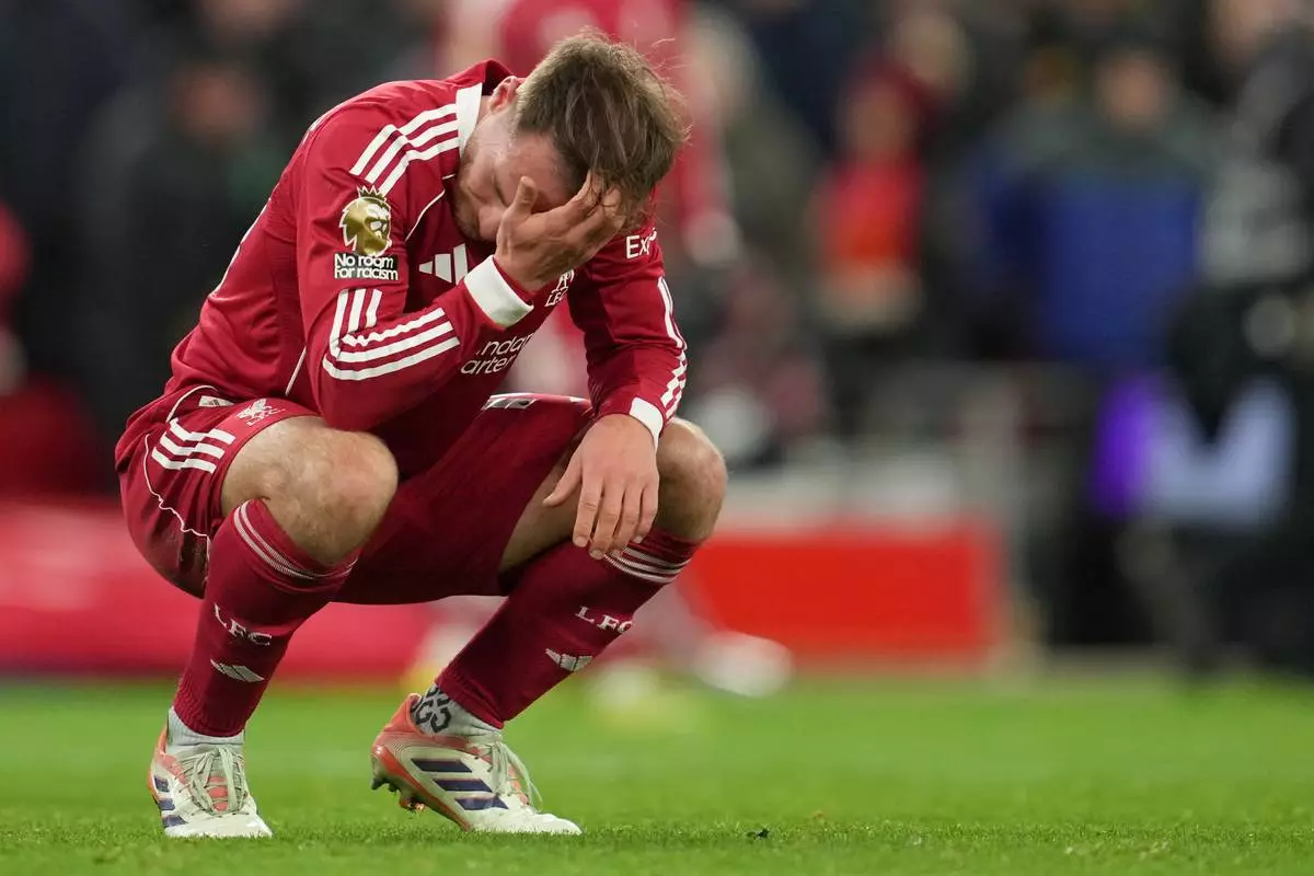 Liverpool's Alexis Mac Allister reacts at the end of the English Premier League soccer match between Liverpool and Leeds United in Liverpool, England, Thursday, Jan. 1, 2026. (AP Photo/Jon Super)