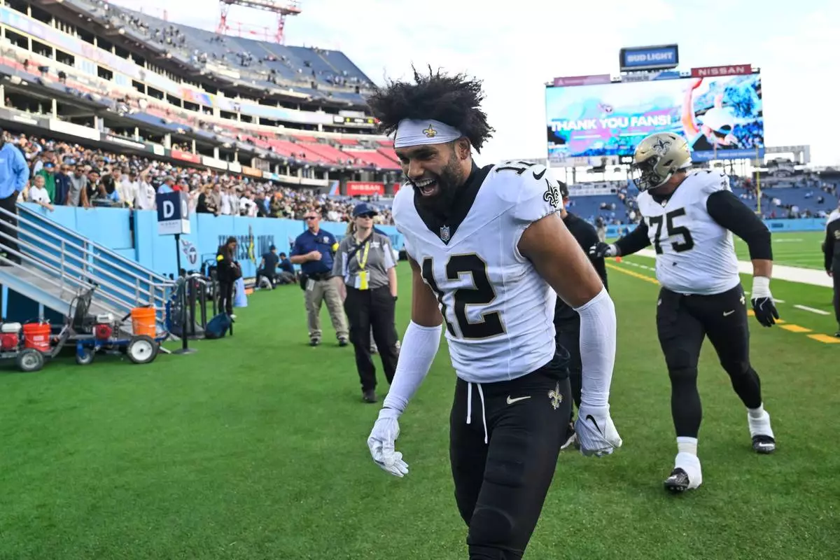 New Orleans Saints wide receiver Chris Olave (12) walks off the field after an NFL football game against the Tennessee Titans, Sunday, Dec. 28, 2025, in Nashville, Tenn. (AP Photo/John Amis)