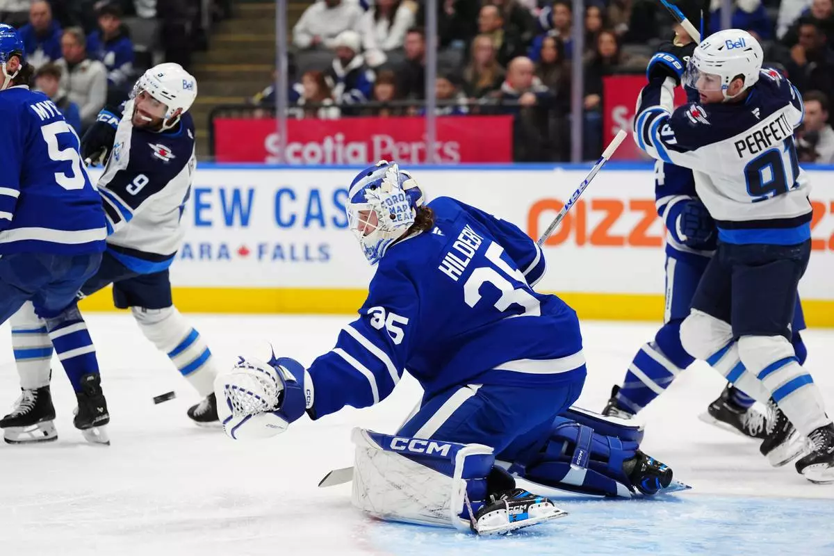 Toronto Maple Leafs goaltender Dennis Hildeby (35) makes a save against the Winnipeg Jets during during the third period of an NHL hockey game in Toronto, Thursday, Jan. 1, 2026. (Frank Gunn/The Canadian Press via AP)