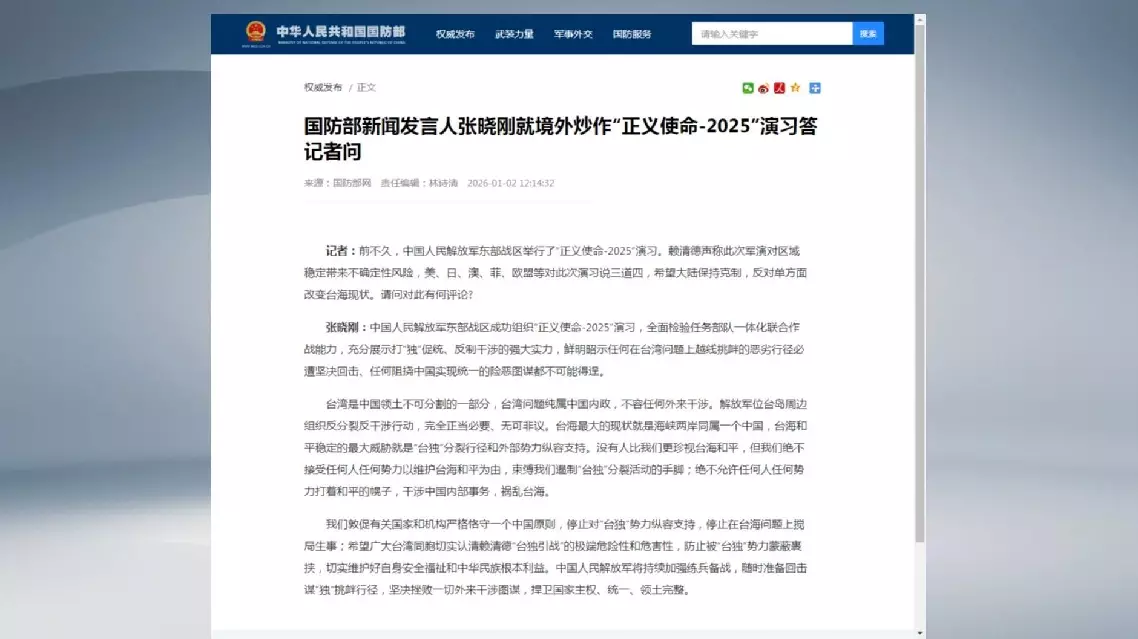 Zhang Xiaogang, spokesperson for China's Ministry of National Defense, made the response to a media query about statements from Taiwan leader Lai Ching-te and several countries including the United States, Japan, Australia and the Philippines on the recent "Justice Mission 2025" military exercises conducted by the Chinese People's Liberation Army (PLA) Eastern Theater Command.