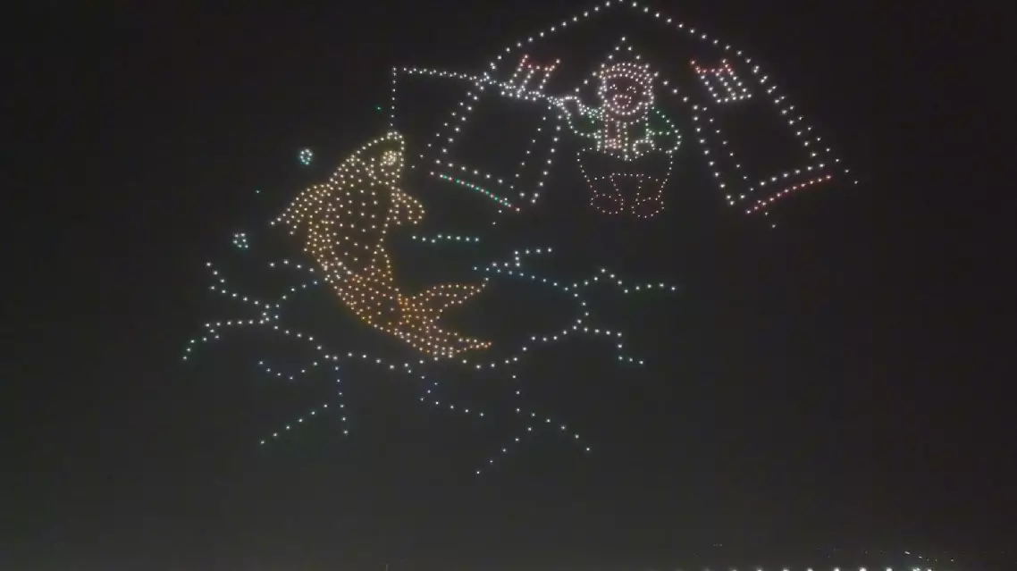 As night set in, the town was illuminated, with traditional buildings bathed in warm yellow light, a drone show, and a holographic sky projection reading "Happy New Year to everyone" as a phoenix-shaped lantern flew by.