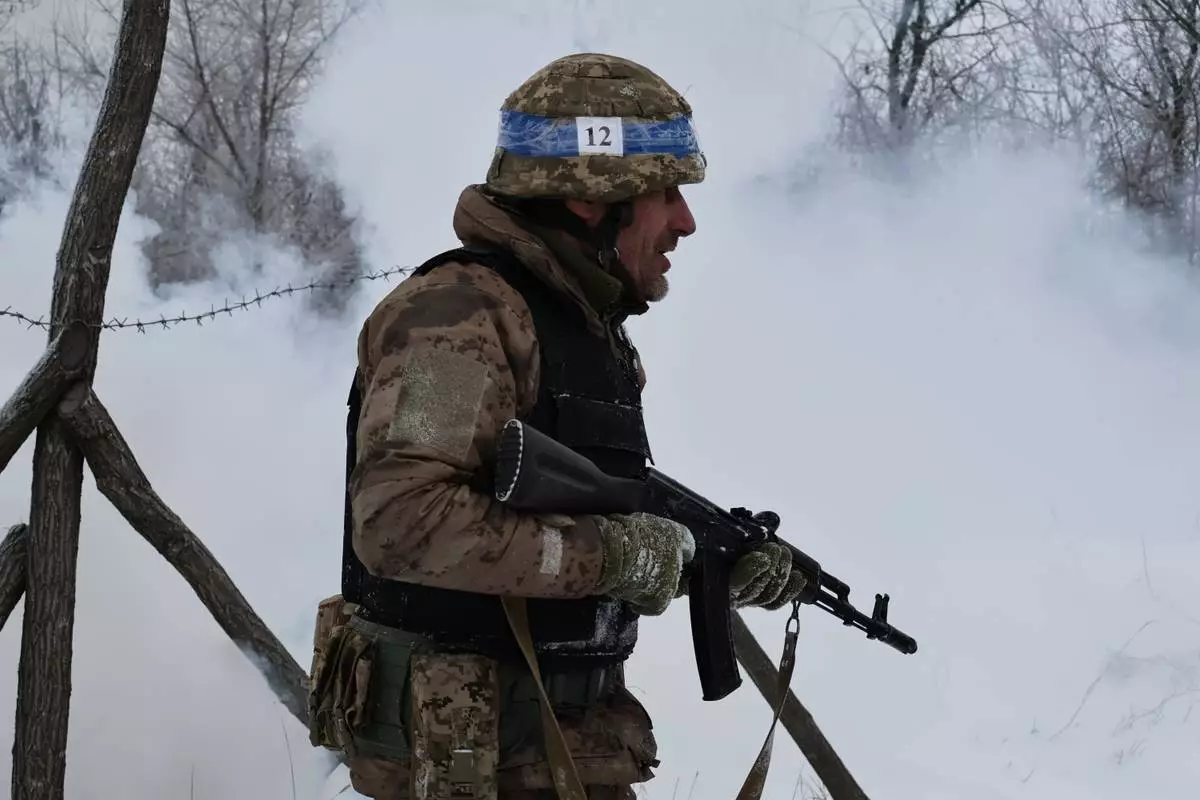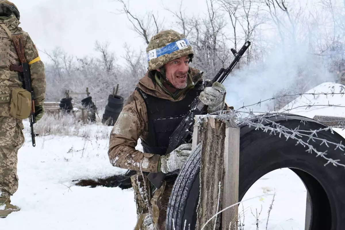 In this photo provided by Ukraine's 65th Mechanized Brigade press service, recruits perform drills at a training ground in the Zaporizhzhia region, Ukraine, Thursday, Jan. 1, 2026. (Andriy Andriyenko/Ukraine's 65th Mechanized Brigade via AP)