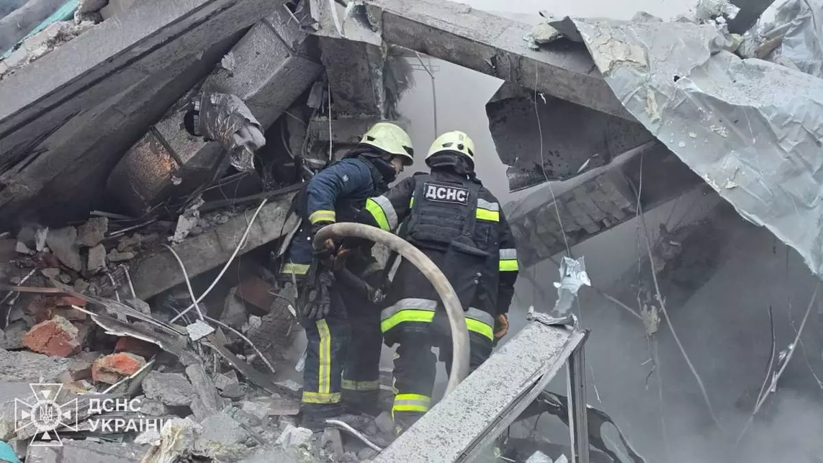 In this photo provided by the Ukrainian Emergency Service, emergency services personnel work to extinguish a fire following a Russian missile attack in Kharkiv, Ukraine, Friday, Jan. 2, 2026. (Ukrainian Emergency Service via AP)
