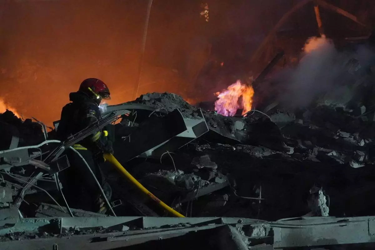 Emergency services personnel work to extinguish a fire following a Russian missile attack in Kharkiv, Ukraine, Friday, Jan. 2, 2026.(AP Photo/Andrii Marienko)