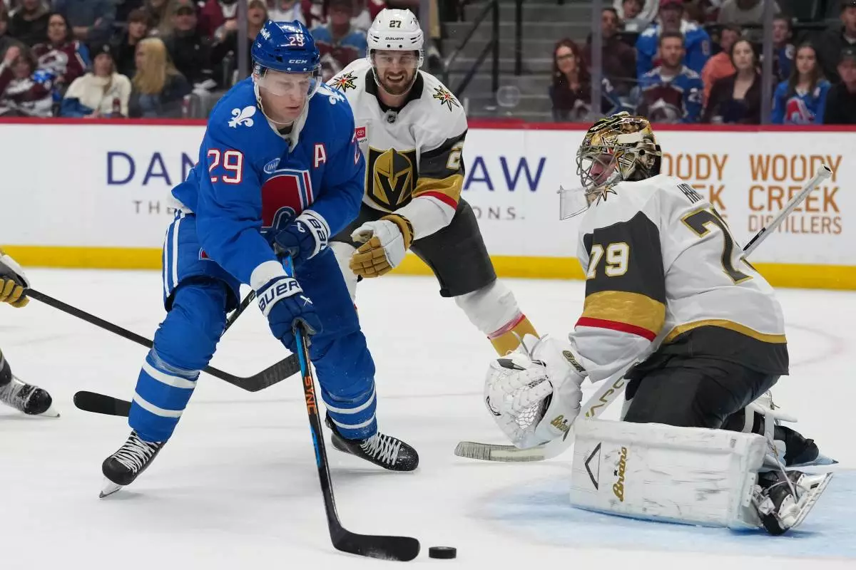 Colorado Avalanche center Nathan MacKinnon, left, puts a shot on Vegas Golden Knights goaltender Carter Hart, right, after driving past defenseman Shea Theodore in the third period of an NHL hockey game Saturday, April 11, 2026, in Denver. (AP Photo/David Zalubowski)