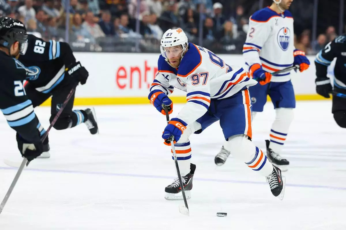 Edmonton Oilers center Connor McDavid (97) goes after the puck against the Utah Mammoth during the second period of an NHL hockey game, Tuesday, April 7, 2026, in Salt Lake City. (AP Photo/Melissa Majchrzak)