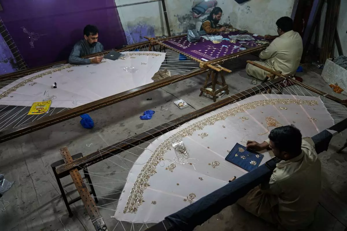 Artisans prepare traditional embroidery bridal dresses at their workshop in an old neighborhood of Lahore, Pakistan, Tuesday, Dec. 30, 2025. (AP Photo/K.M. Chaudary)