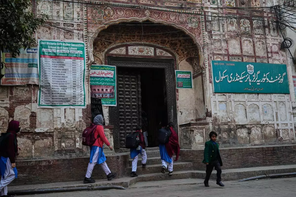 Students enter their school, set up in an old heritage building which was built during the Mughal era, in an old neighborhood of Lahore, Pakistan, Wednesday, Dec. 3, 2025. (AP Photo/K.M. Chaudary)