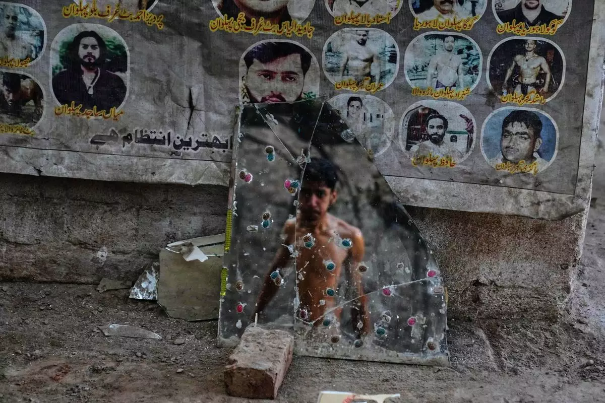 A young wrestler reflects on a mirror as he attends a training session in a wrestling academy at in old neighborhood of Lahore, Pakistan, Tuesday, Dec. 9, 2025. (AP Photo/K.M. Chaudary)