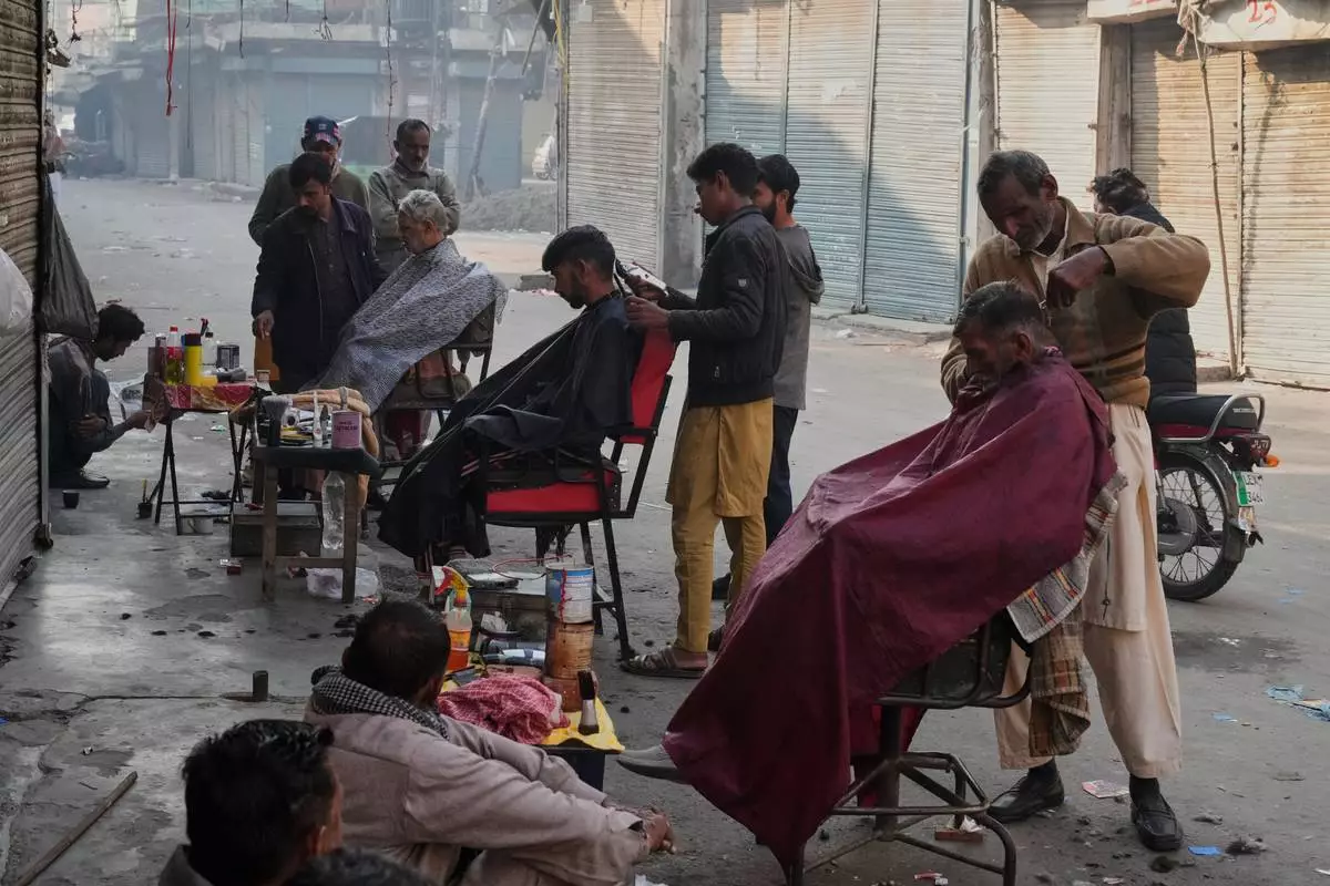Local residents get their haircut from street barbers in an old neighborhood of Lahore, Pakistan, Sunday, Dec. 7, 2025. (AP Photo/K.M. Chaudary)