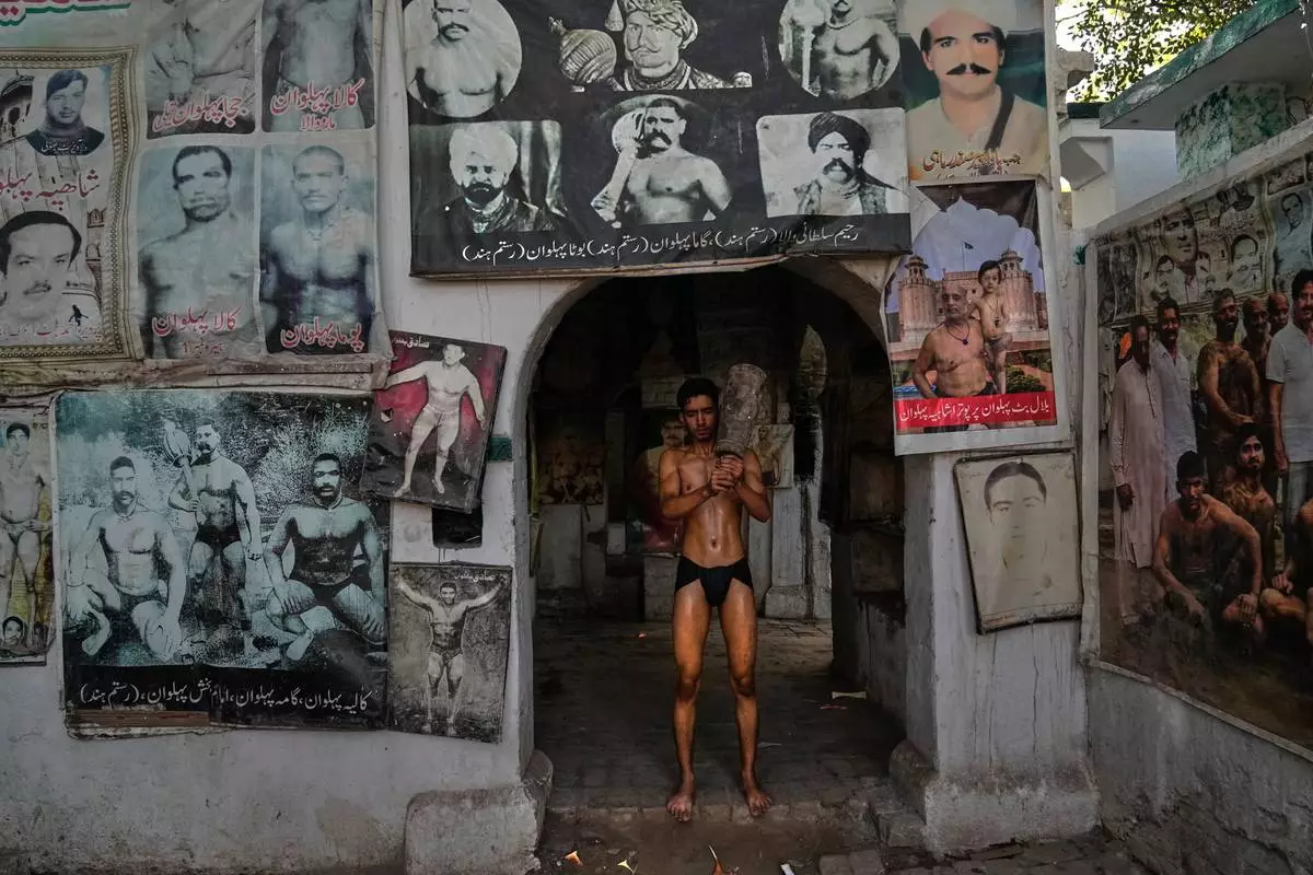 A young wrestler attends a training session in a wrestling academy in an old neighborhood of Lahore, Pakistan, Tuesday, Dec. 9, 2025. (AP Photo/K.M. Chaudary)