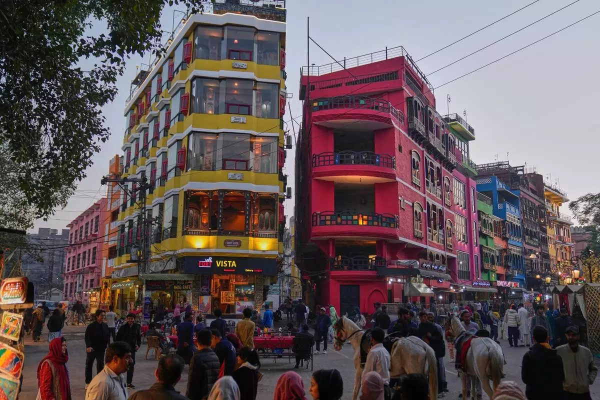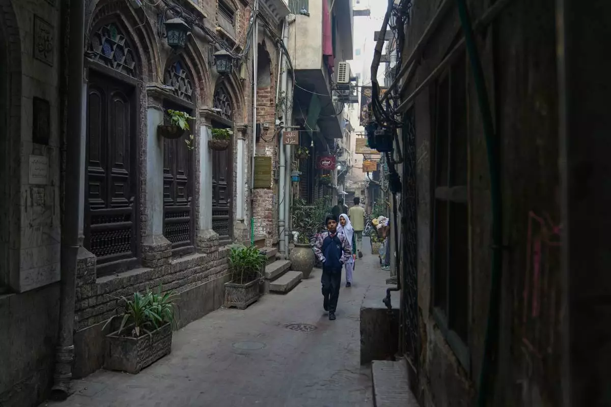 People walk past heritage buildings, which convert in a modern restaurants in an old neighborhood of Lahore, Pakistan, Monday, Dec. 8, 2025. (AP Photo/K.M. Chaudary)