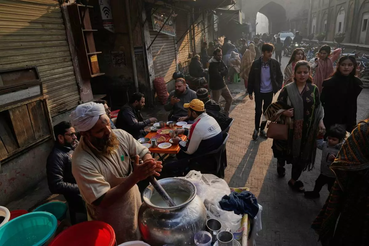 Locals buy a traditional breakfast dish called "Paye" in an old neighborhood in Lahore, Pakistan, Sunday, Dec. 7, 2025. (AP Photo/K.M. Chaudary)