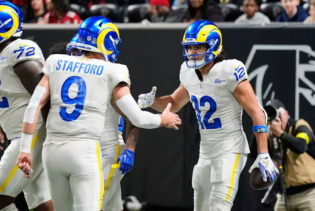 Los Angeles Rams wide receiver Puka Nacua (12) celebrates his touchdown with quarterback Matthew Stafford (9) in the second half of an NFL football game against the Atlanta Falcons, Monday, Dec. 29, 2025, in Atlanta. (AP Photo/Mike Stewart)