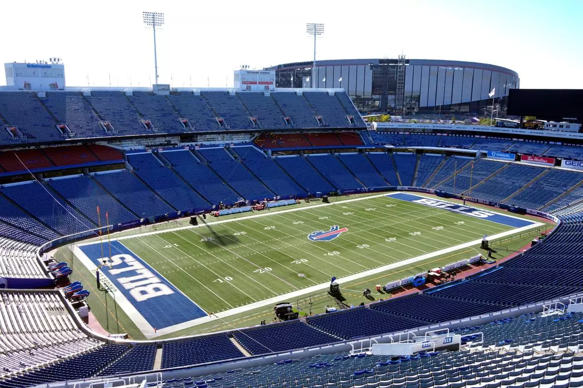 FILE - The existing Highmark Stadium, foreground, frames the construction on the new Highmark Stadium, upper right, which is scheduled to open with the 2026 season, shown before an NFL football game between the Buffalo Bills and the New England Patriots, Oct. 5, 2025, in Orchard Park, N.Y. (AP Photo/Gene J. Puskar, File)