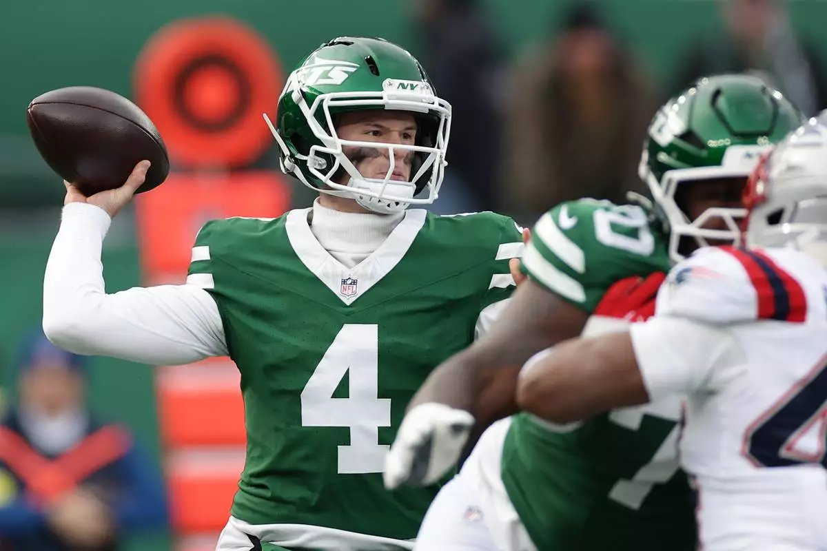 New York Jets quarterback Brady Cook passes against the New England Patriots during the first half of an NFL football game, Sunday, Dec. 28, 2025, in East Rutherford, N.J. (AP Photo/Adam Hunger)