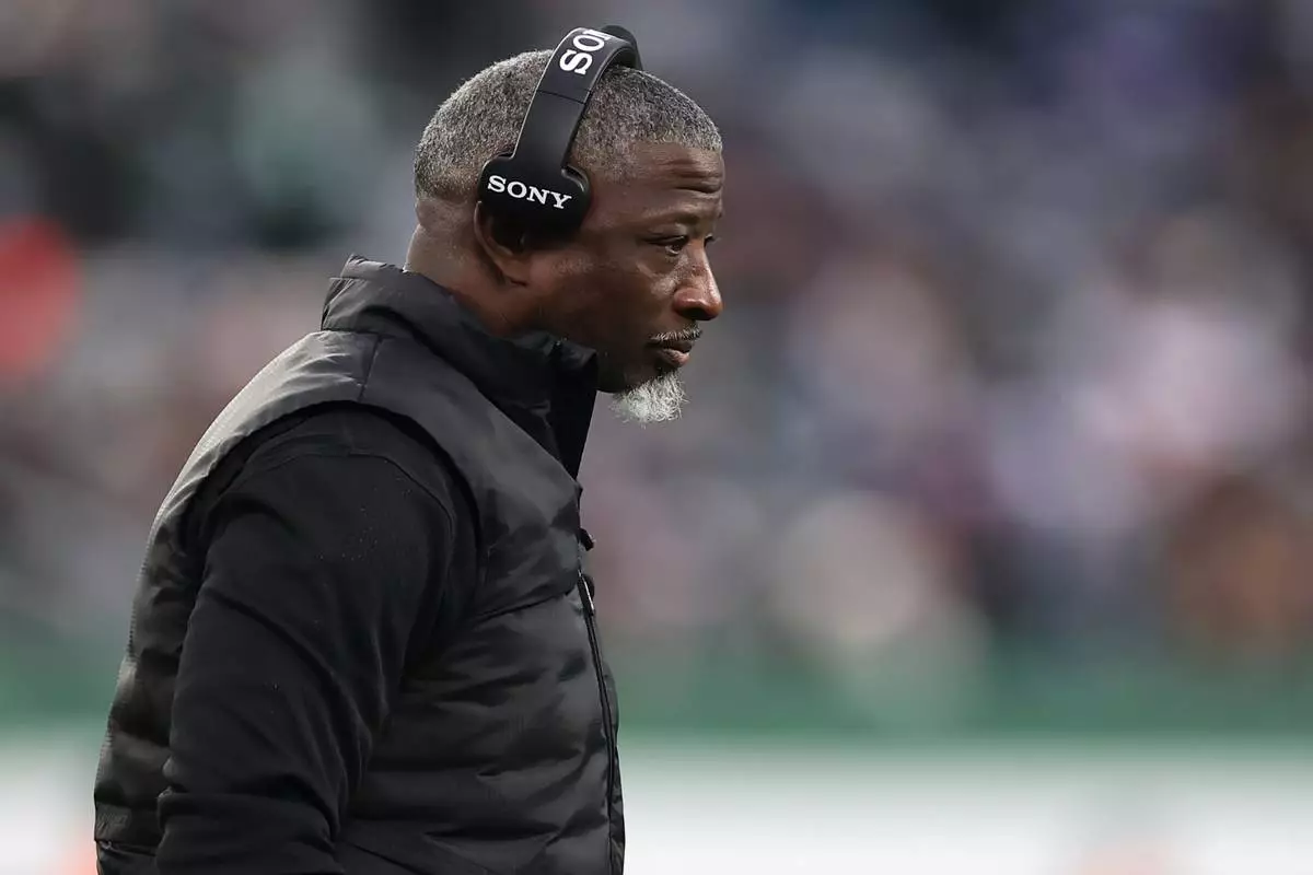 New York Jets head coach Aaron Glenn looks on during the second half of an NFL football game against the New England Patriots, Sunday, Dec. 28, 2025, in East Rutherford, N.J. (AP Photo/Adam Hunger)