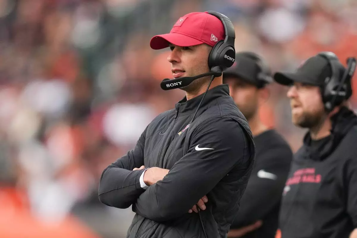 Arizona Cardinals head coach Jonathan Gannon watches from the sideline during the first half of an NFL football game against the Cincinnati Bengals, Sunday, Dec. 28, 2025, in Cincinnati. (AP Photo/Joshua A. Bickel)