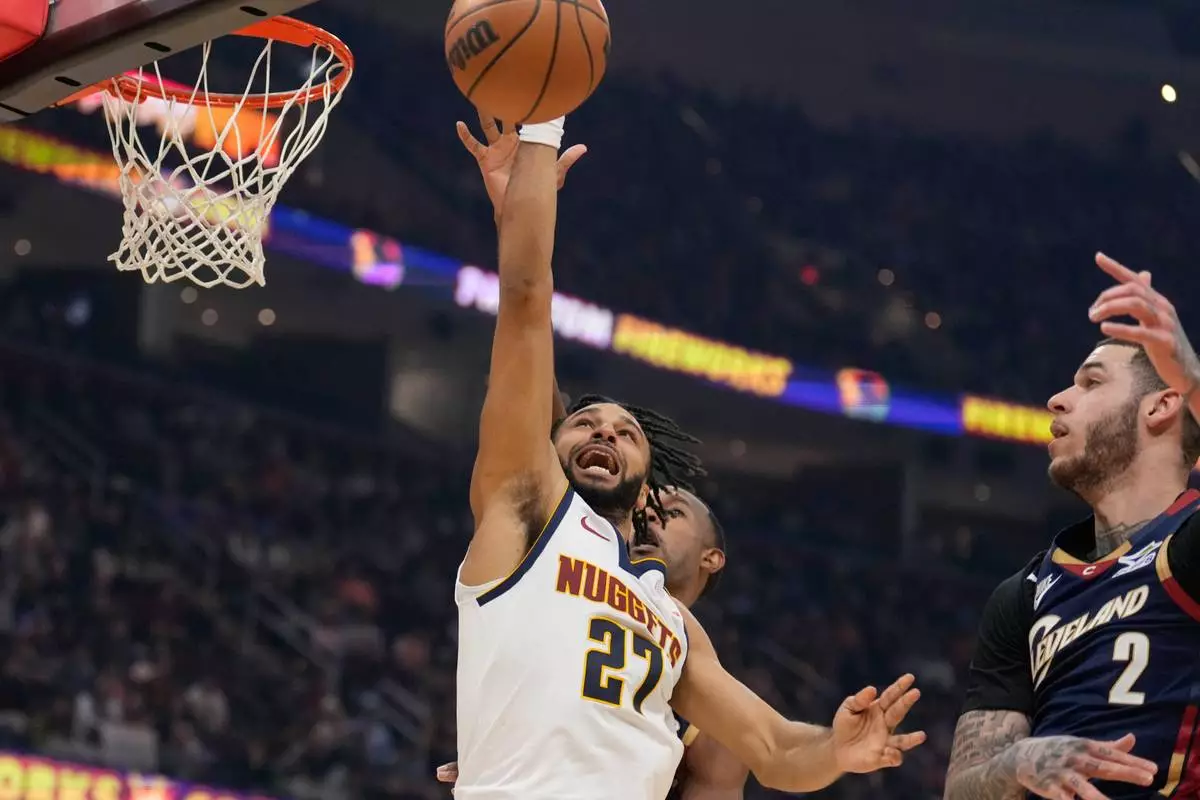 Denver Nuggets guard Jamal Murray (27) shoots in front of Cleveland Cavaliers center Evan Mobley, rear, and next to guard Lonzo Ball (2) in the first half of an NBA basketball game Friday, Jan. 2, 2026, in Cleveland. (AP Photo/Sue Ogrocki)