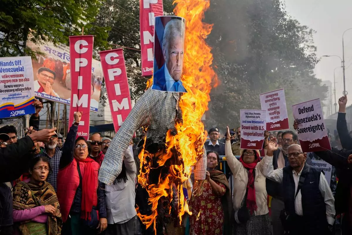Activists of Communist Party of India (Marxist-Leninist) Liberation burn an effigy of Donald Trump during a protest against a U.S. military operation that removed Venezuelan leader Nicolas Maduro from the country, near the U.S. Consulate, in Kolkata, India, Monday, Jan. 5, 2026. (AP Photo/Bikas Das)