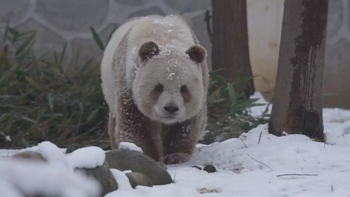 World's only captive brown giant panda enjoys snowy fun