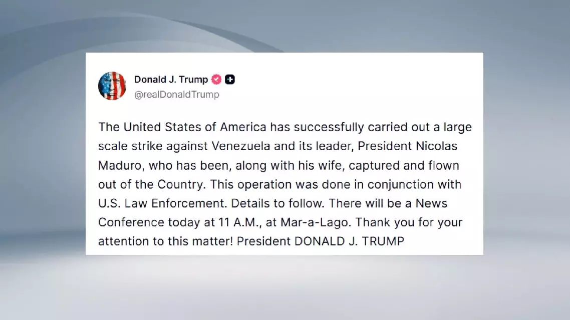 On Saturday, the United States launched a large-scale strike on Venezuela, during which Venezuelan President Nicolas Maduro and his wife were 'captured and flown out of Venezuela' according to a post by U.S. President Donald Trump on his Truth Social account.