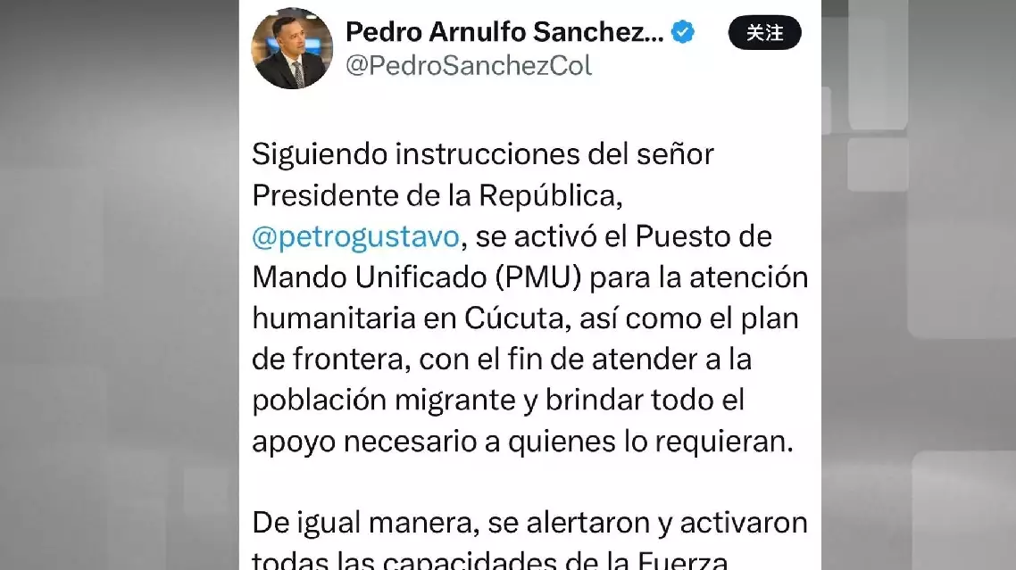 Following instructions of President Gustavo Petro, the defense minister said the Unified Command Post (PMU) for humanitarian assistance as well as an action plan was activated in northeastern Colombia's border city of Cucuta in order to assist the migrant population and provide all necessary support to those who require it.