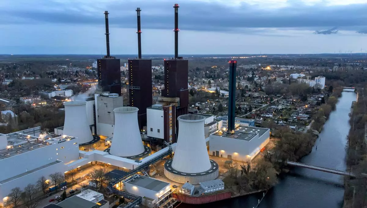 FILE - Steam leaves a cooling tower of the Lichterfelde gas-fired power plant near a cable bridge crossing the Teltow canal in Berlin, Germany, on March 30, 2022. (AP Photo/Michael Sohn, File)