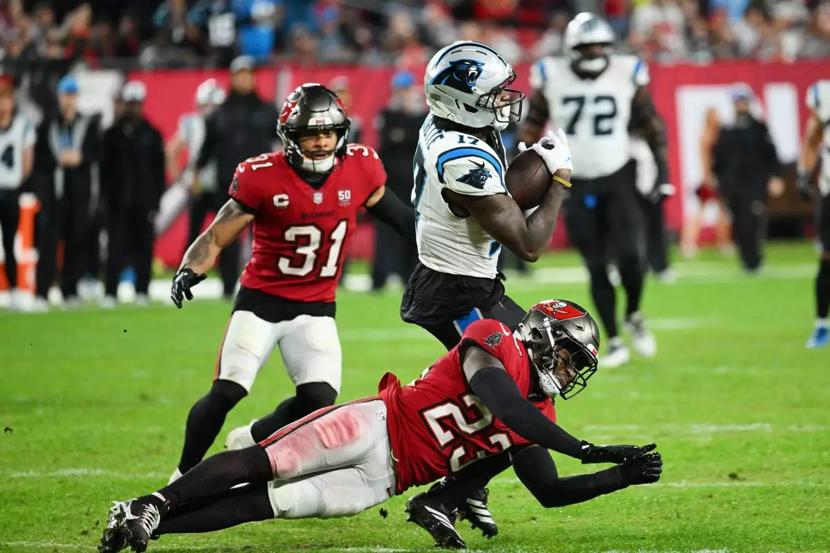 Carolina Panthers wide receiver Xavier Legette (17) makes a catch over Tampa Bay Buccaneers safety Tykee Smith (23) during the second half of an NFL football game Saturday, Jan. 3, 2026, in Tampa, Fla. (AP Photo/Jason Behnken)
