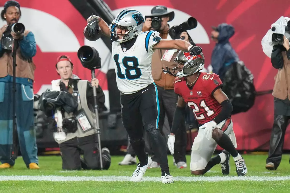 Carolina Panthers wide receiver Jalen Coker (18) reacts after his touchdown catch over Tampa Bay Buccaneers cornerback Benjamin Morrison (21) during the second half of an NFL football game Saturday, Jan. 3, 2026, in Tampa, Fla. (AP Photo/Chris O'Meara)