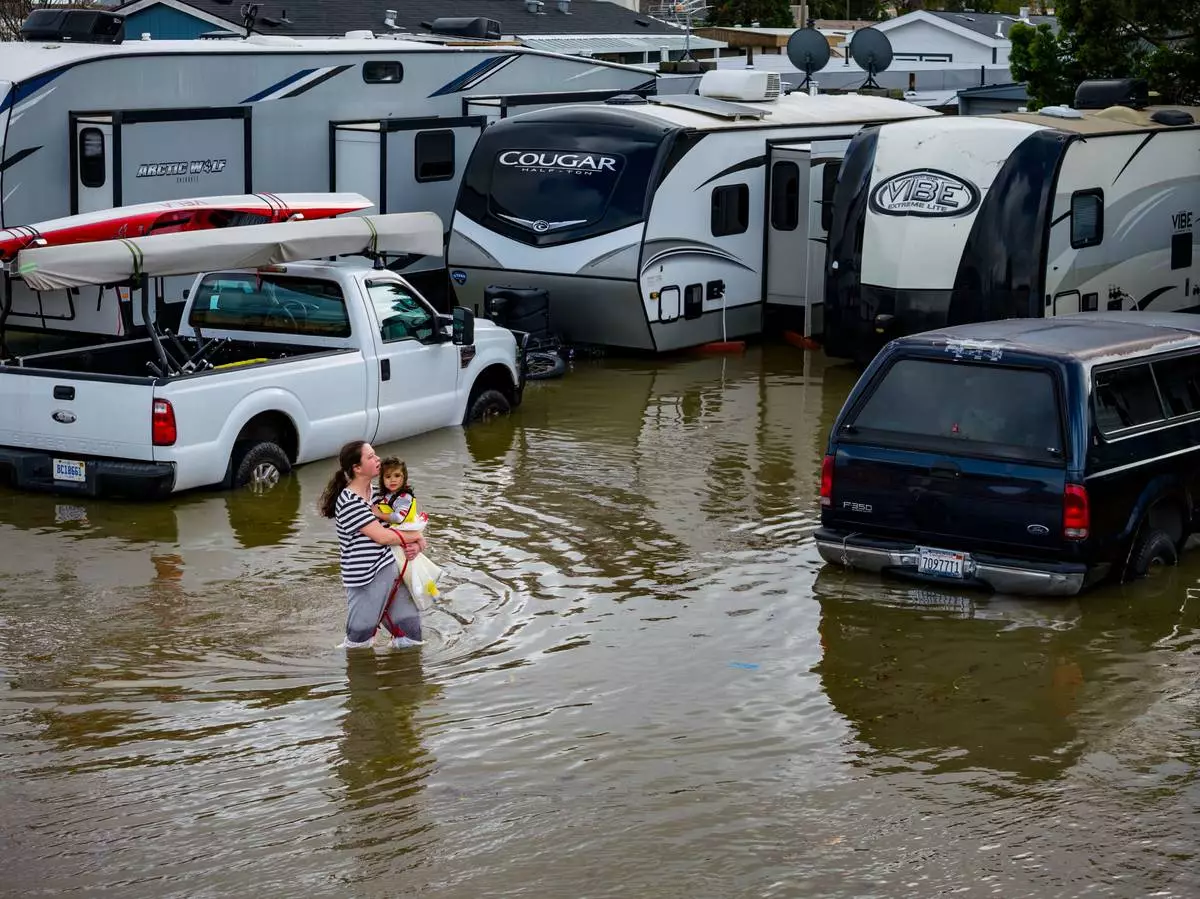 People wade through an rv park flooded by the "King Tides", occurring when the sun, moon and Earth align, causing a stronger gravitational pull Saturday, Jan. 3, 2026, near Corte Madera in Marin County, Calif. (AP Photo/Ethan Swope)