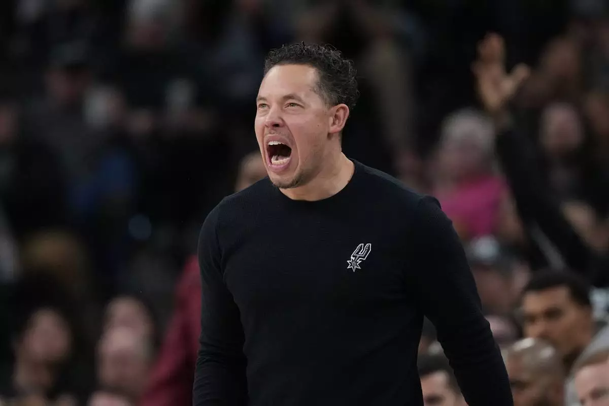 San Antonio Spurs head coach Mitch Johnson calls to his players during the first half of an NBA basketball game against the Portland Trail Blazers in San Antonio, Saturday, Jan. 3, 2026. (AP Photo/Eric Gay)