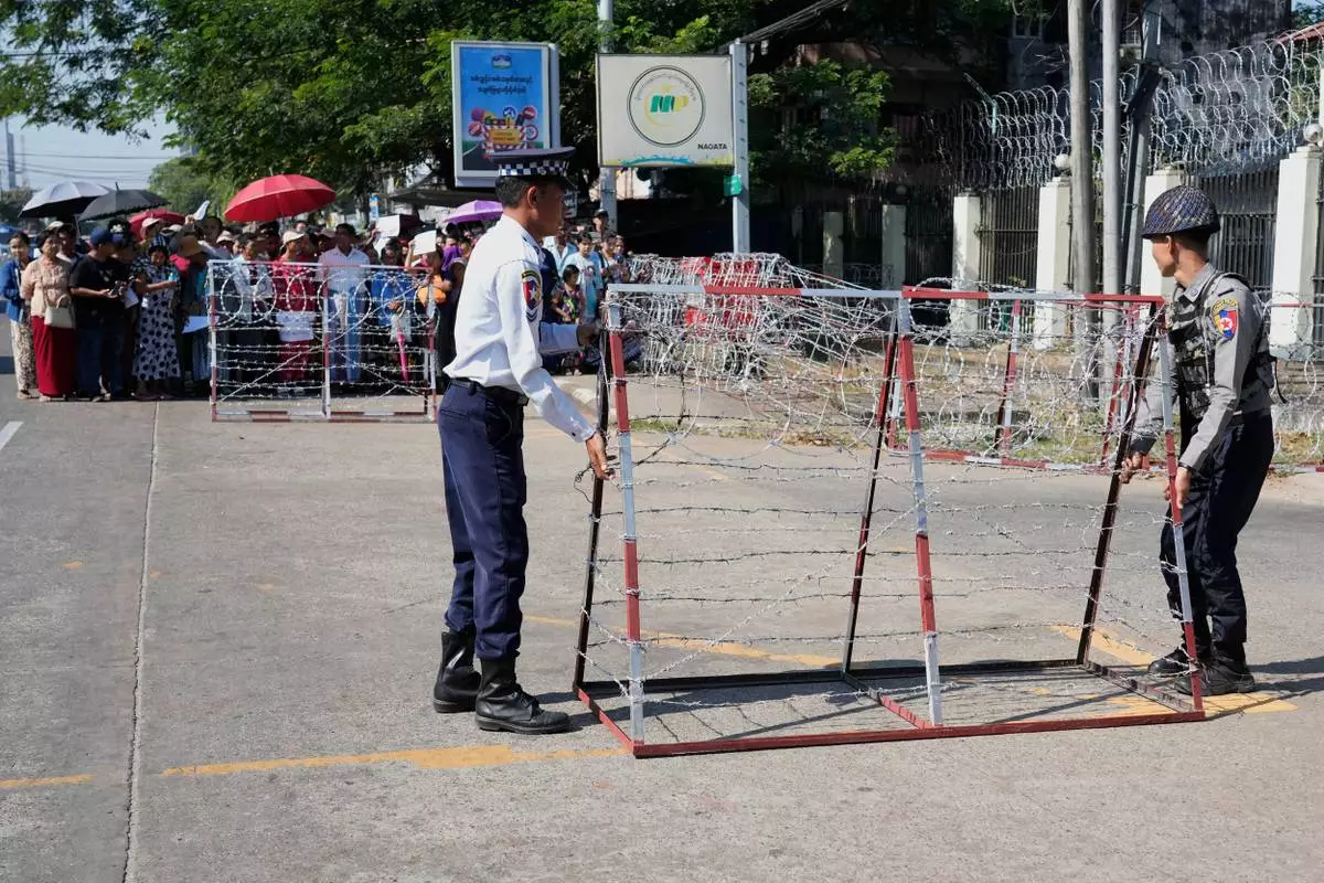 Polices set up a barricade while family members and colleagues wait to welcome the released prisoners from Insein Prison Sunday, Jan. 4, 2026, in Yangon, Myanmar. (AP Photo/Thein Zaw)